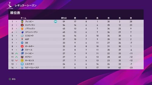 早速マスターリーグの続きです。 冬の移籍市場も終わり、カップ戦も敗退したので、残すはリーグ戦のみです。 第23節 H オールボー 2-0 〇 第24節 A シルケボー 0-1 〇 第25節 H OB 0-0 △ 第26節 H ラナース 0-0 △ 2戦連続でまたスコアレスドロー。やはり得点…
